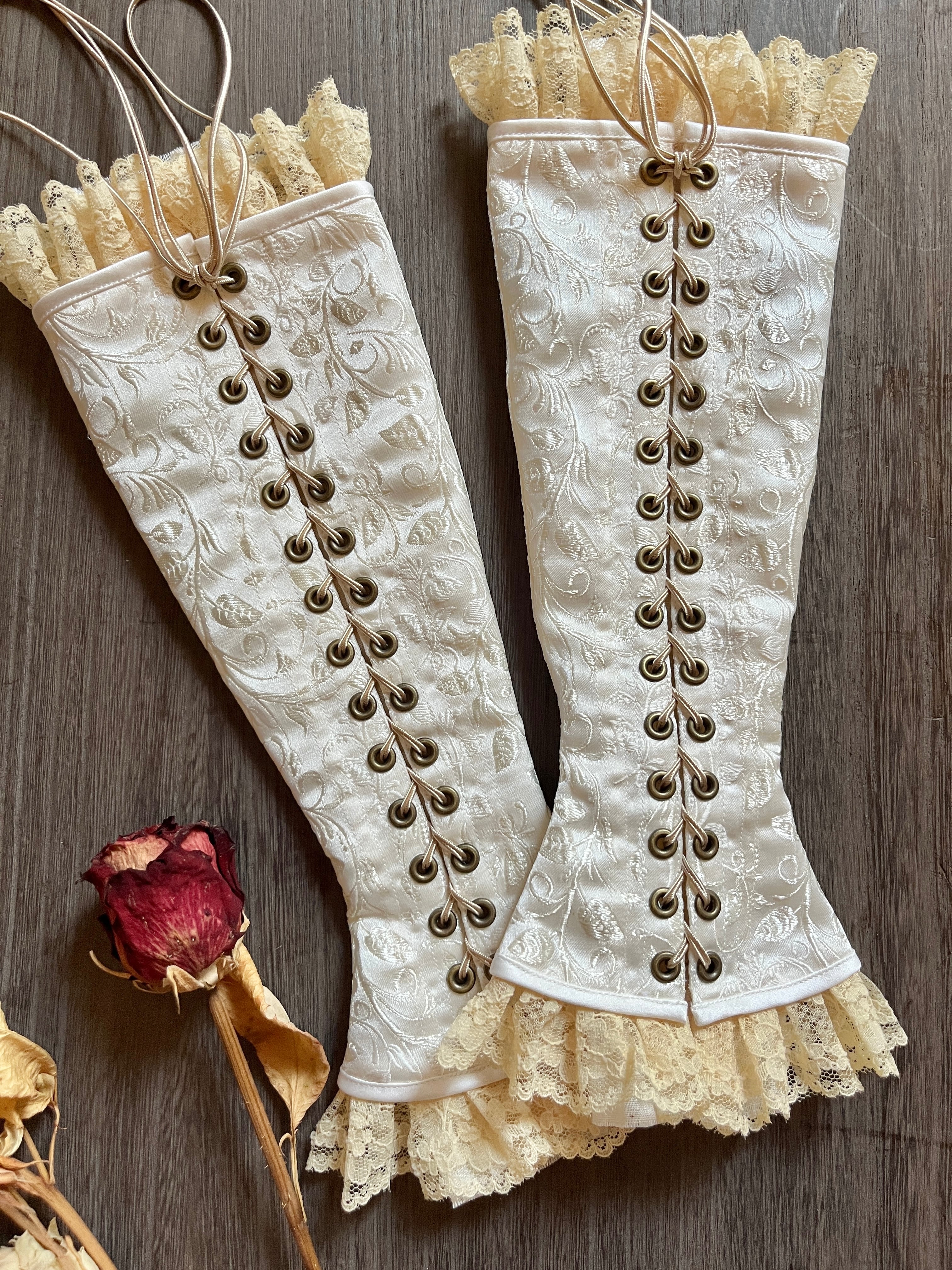 ■コルセットをイメージしたアームカバーです。光沢のあるポリエステルジャカード地を使用。織りで表現された唐草風の植物柄が光の加減で浮かび上がります。黒ニッケル色の金属ハトメによる編み上げが手許を美しく演出します。当て布は切りっぱなし+解れ過ぎ防止の二重ステッチ。当て布両端の切りっぱなし部分は使い込むにつれ自然にほつれてアンティーク布のようなムードになります。