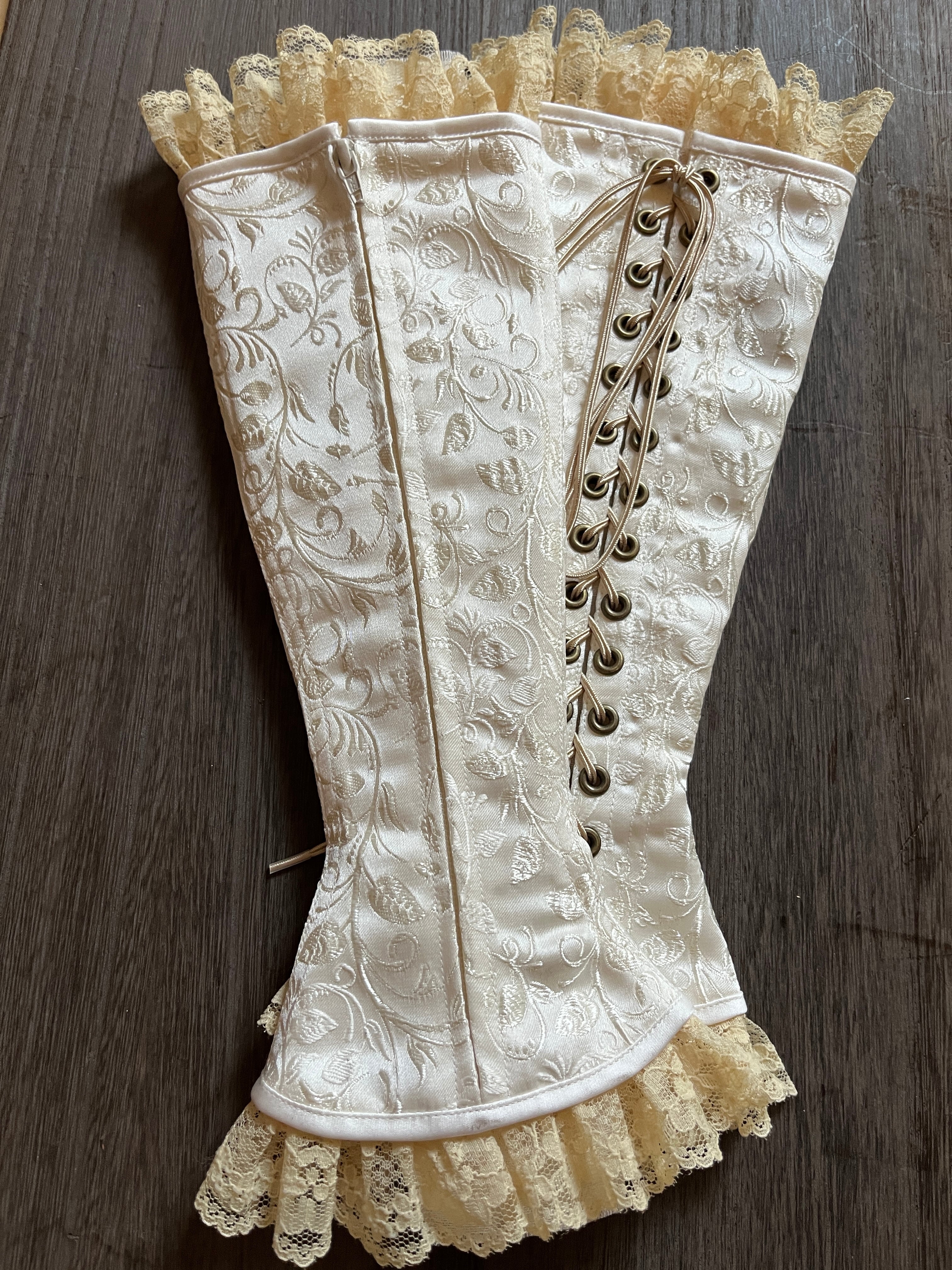 The modesty cloth inside lace up is left uncut and double-stitched to prevent excessive fraying. The left-over pieces at both ends of the fabric will naturally fray as it is used and will give the touch of gothic aging.