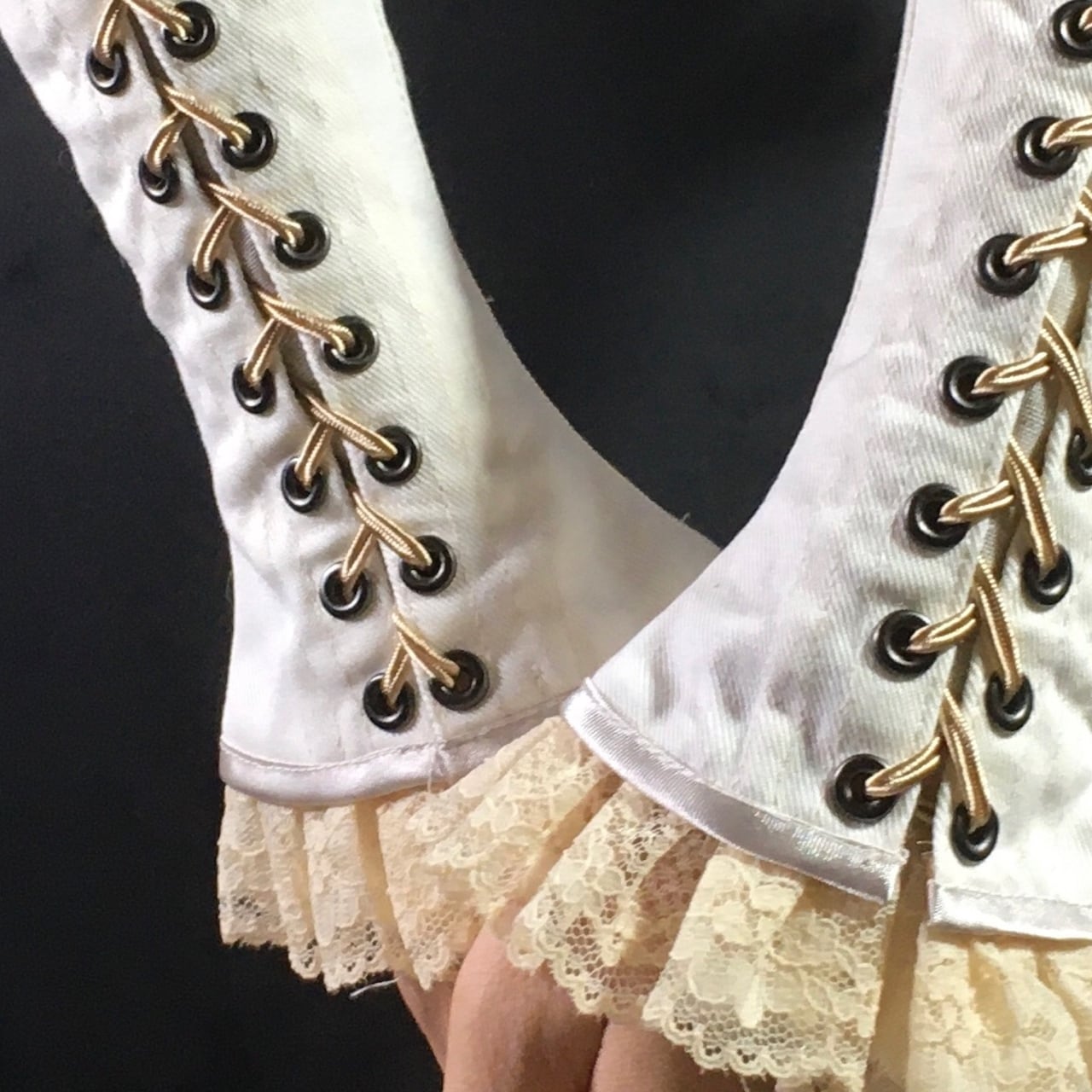 The modesty cloth inside lace up is left uncut and double-stitched to prevent excessive fraying. The left-over pieces at both ends of the fabric will naturally fray as it is used and will give the touch of gothic aging.