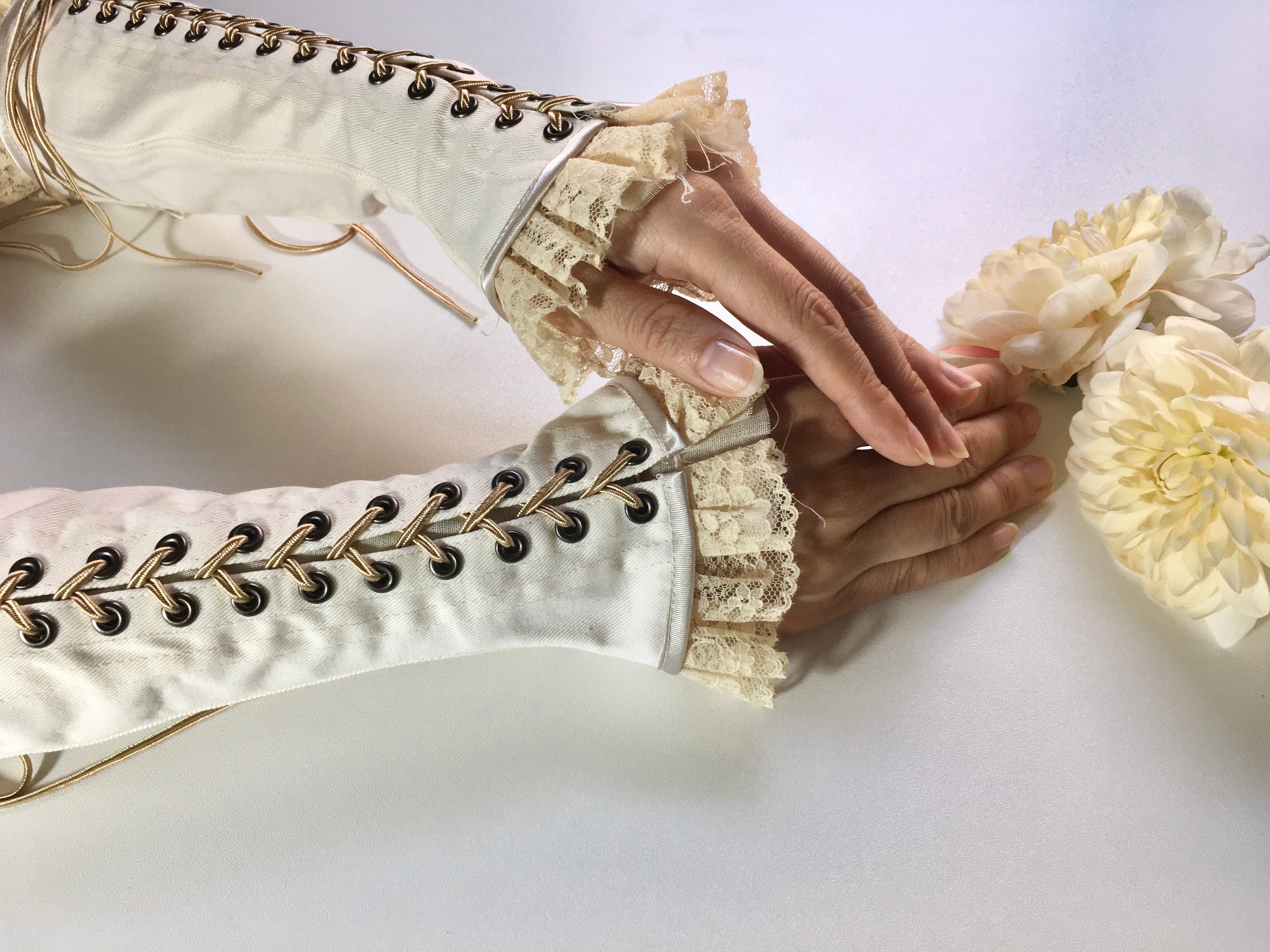 コルセットをイメージしたアームカバーです。黒ニッケル色の金属ハトメによる編み上げが手許を美しく演出します。当て布は切りっぱなし+解れ過ぎ防止の二重ステッチ。当て布両端の切りっぱなし部分は使い込むにつれ自然にほつれてアンティーク布のようなムードになります。