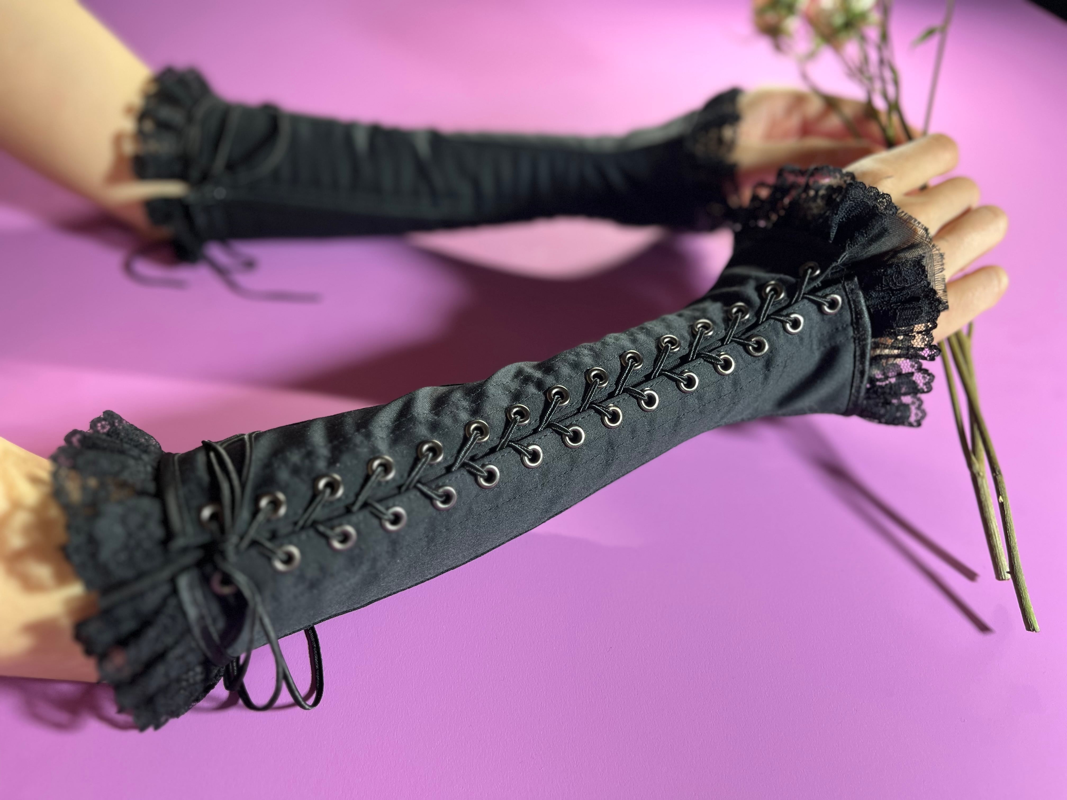 コルセットをイメージしたアームカバーです。黒ニッケル色の金属ハトメによる編み上げが手許を美しく演出します。当て布は切りっぱなし+解れ過ぎ防止の二重ステッチ。当て布両端の切りっぱなし部分は使い込むにつれ自然にほつれてアンティーク布のようなムードになります。